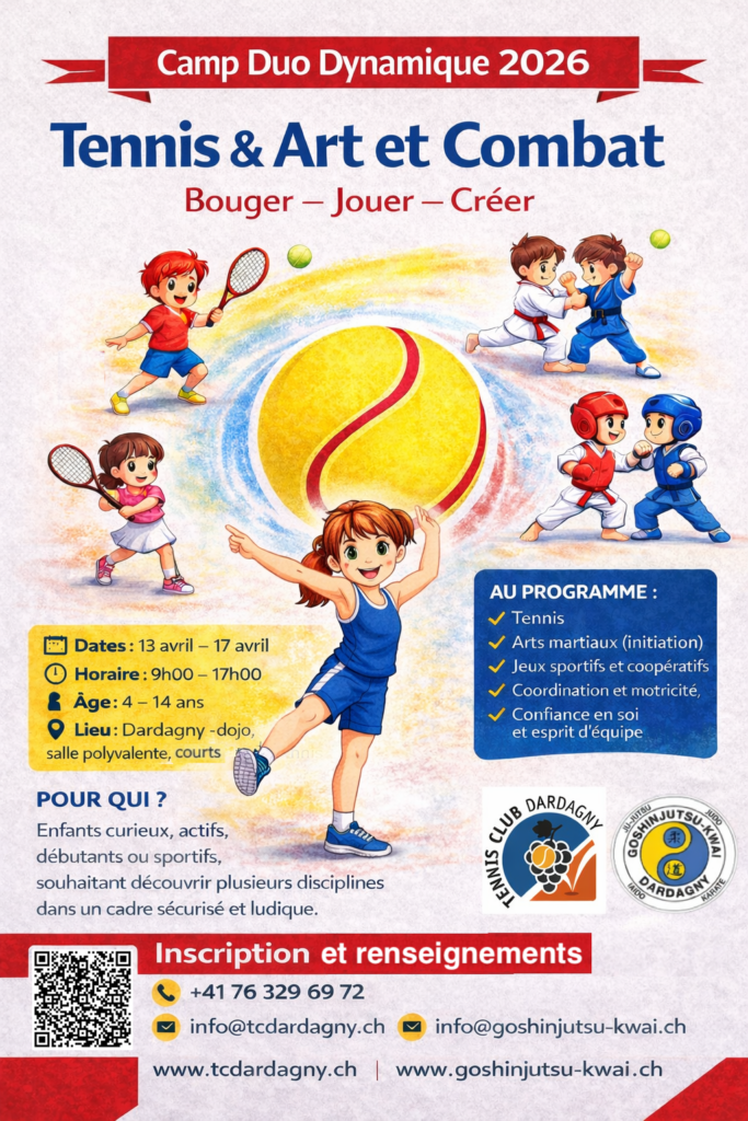 Le Tennis-Club Dardagny et le Club du Goshinjutsu-Kwai s’unissent pour proposer aux enfants et aux jeunes de 4 à 14 ans un camp innovant alliant tennis, arts martiaux et art scénique.