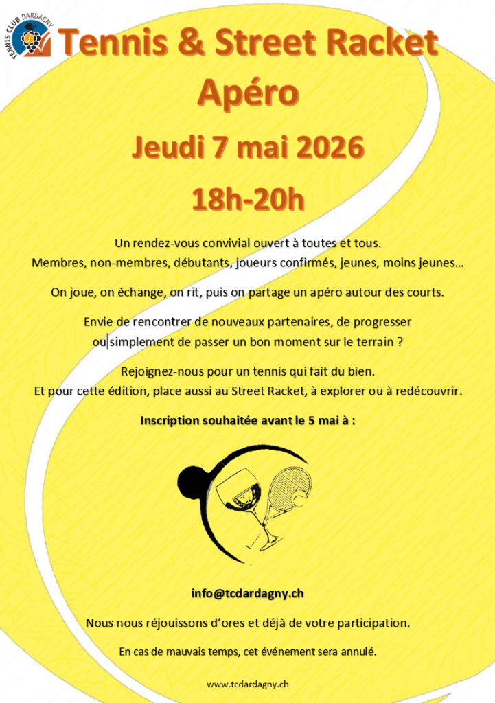 Inscrivez-vous vite à info@tcdardagny.ch, en précisant le nom et le prénom des participants, jusqu’au mardi 21 avril.